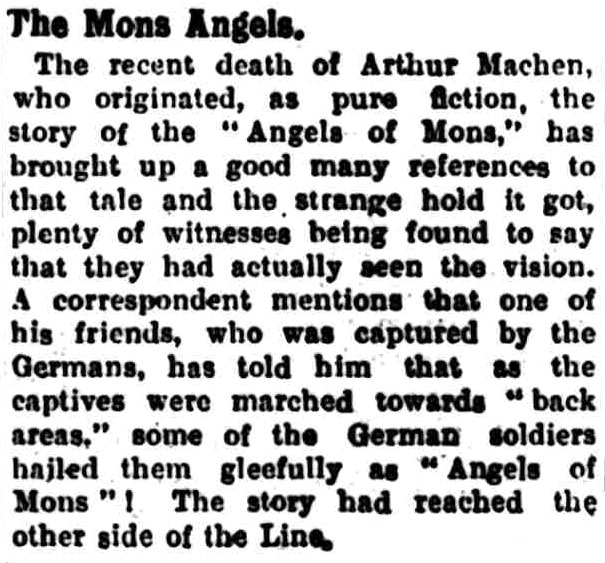 Of course, Machen still had about fifteen years in the tank, finally passing away in December 1947 at the age of 84. The item gives no details into his supposed death. It is not currently known if Machen was aware of this false report, but perhaps, he would have shrugged his shoulders indifferently as simply being remembered for the Angle of Mons controversy. A decade earlier, Machen, as a reporter for the Evening News, had been involved in the premature obituary of another literary luminary, Lord Alfred Douglas.