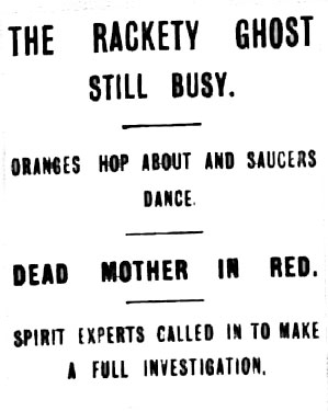 A rush by everyone to the kitchen followed, and it was seen that two saucers which has been on the top of the dresser had been flung to the floor and smashed to bits.